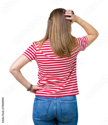 Middle age mature woman wearing casual t-shirt over isolated background Backwards thinking about doubt with hand on head
