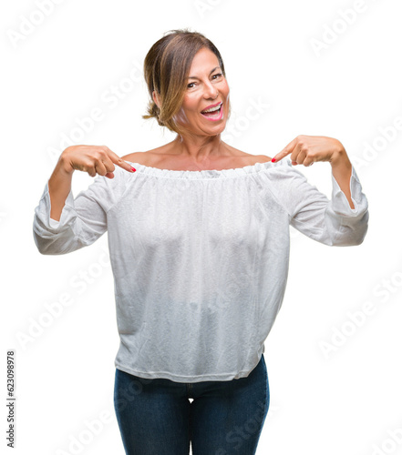 Middle age senior hispanic woman over isolated background looking confident with smile on face, pointing oneself with fingers proud and happy.