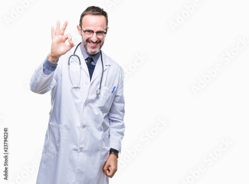 Middle age senior hoary doctor man wearing medical uniform isolated background smiling positive doing ok sign with hand and fingers. Successful expression.