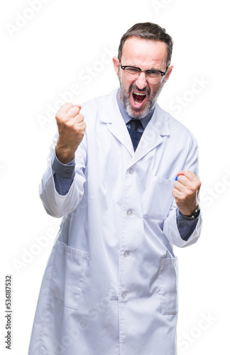 Middle age senior hoary professional man wearing white coat over isolated background very happy and excited doing winner gesture with arms raised, smiling and screaming for success. Celebration