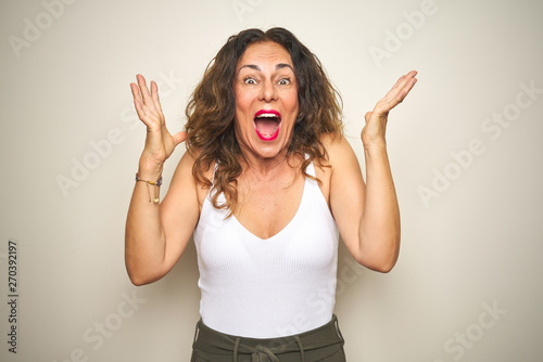Middle age senior woman standing over white isolated background celebrating crazy and amazed for success with arms raised and open eyes screaming excited. Winner concept