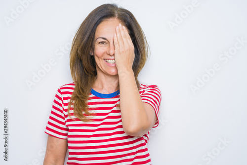 Middle age senior woman standing over white isolated background covering one eye with hand, confident smile on face and surprise emotion.