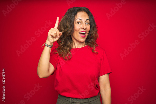 Middle age senior woman with curly hair over red isolated background pointing finger up with successful idea. Exited and happy. Number one.