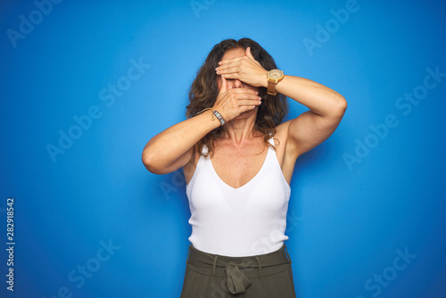 Middle age senior woman with curly hair standing over blue isolated background Covering eyes and mouth with hands, surprised and shocked. Hiding emotion