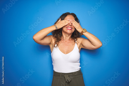 Middle age senior woman with curly hair standing over blue isolated background covering eyes with hands smiling cheerful and funny. Blind concept.