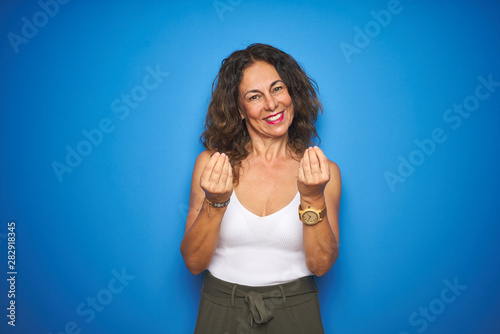 Middle age senior woman with curly hair standing over blue isolated background doing money gesture with hands, asking for salary payment, millionaire business