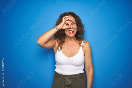 Middle age senior woman with curly hair standing over blue isolated background doing ok gesture with hand smiling, eye looking through fingers with happy face.