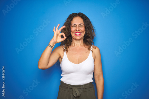 Middle age senior woman with curly hair standing over blue isolated background smiling positive doing ok sign with hand and fingers. Successful expression.