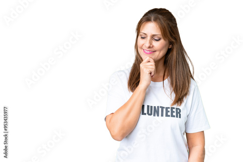 Middle age volunteer woman over isolated background looking to the side and smiling
