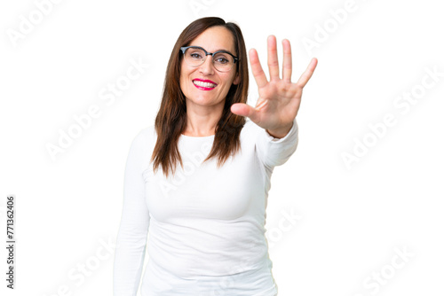 Middle age woman over isolated chroma key background counting five with fingers