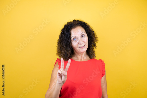 Middle age woman wearing casual shirt standing over isolated yellow background showing and pointing up with fingers number two while smiling confident and happy