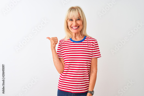 Middle age woman wearing casual striped t-shirt standing over isolated white background smiling with happy face looking and pointing to the side with thumb up.