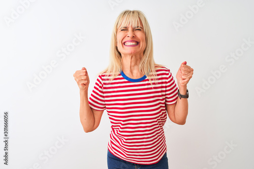 Middle age woman wearing casual striped t-shirt standing over isolated white background very happy and excited doing winner gesture with arms raised, smiling and screaming for success. Celebration