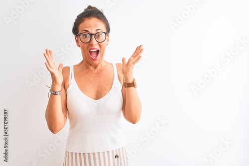 Middle age woman wearing casual t-shirt and glasses standing over isolated white background celebrating crazy and amazed for success with arms raised and open eyes screaming excited. Winner concept