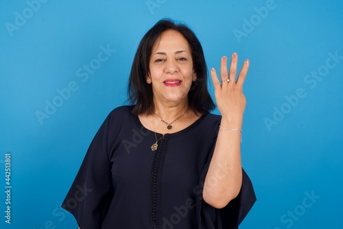 middle aged Arab woman standing against blue background smiling and looking friendly, showing number four or fourth with hand forward, counting down