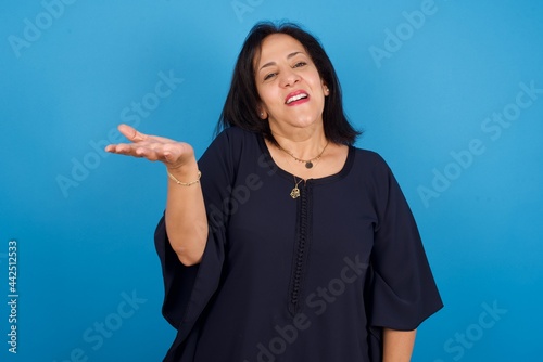 middle aged Arab woman standing against blue background smiling friendly offering something with open hand or handshake as greeting and welcoming. Successful business.