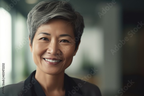 Middle aged asian businesswoman with short hair smiling and looking at camera in office