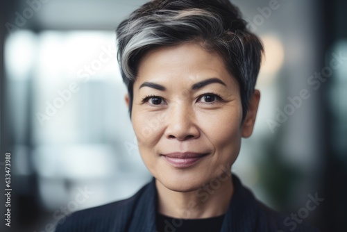 Middle aged asian businesswoman with short hair smiling and looking at camera in office