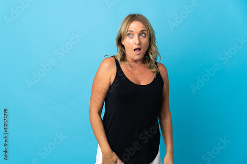 Middle aged blonde woman over isolated background doing surprise gesture while looking to the side