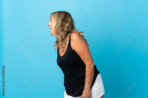 Middle aged blonde woman over isolated background shouting with mouth wide open to the side