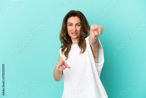 Middle aged caucasian woman isolated on blue background pointing front with happy expression