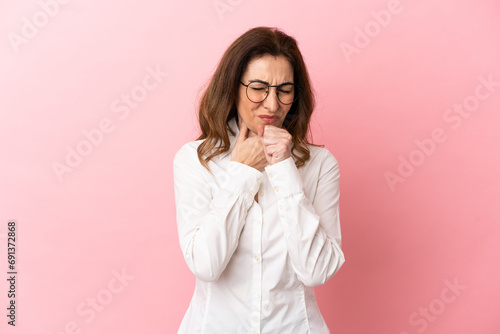 Middle aged caucasian woman isolated on pink background coughing a lot