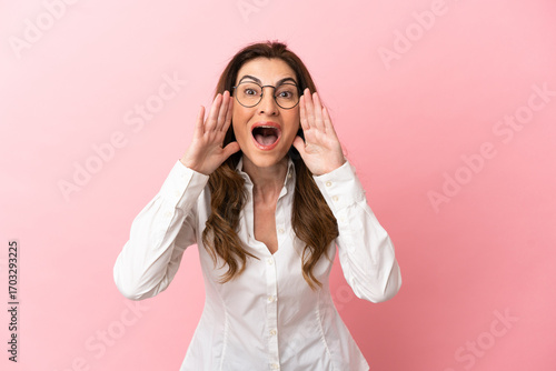 Middle aged caucasian woman isolated on pink background shouting and announcing something
