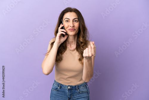 Middle aged caucasian woman using mobile phone isolated on purple background making money gesture