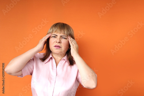 middle aged european woman holding her head, orange background, concept headache, stress, close-up, copy space