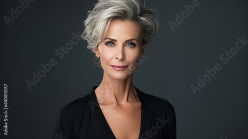 Middle aged female portrait photoshoot on studio background, banner or header, for skin care or anti aging beauty product