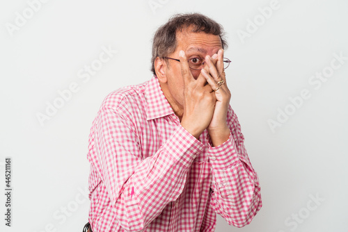 Middle aged indian man isolated on white background blink through fingers frightened and nervous.