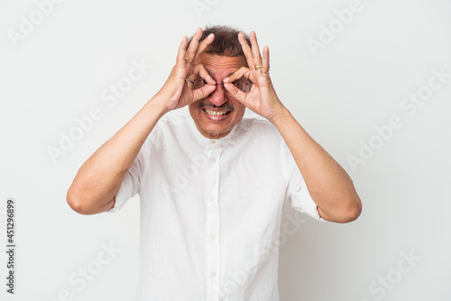 Middle aged indian man isolated on white background showing okay sign over eyes