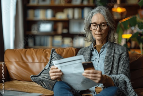 Middle aged woman on sofa scanning paper document with smartphone to laptop for digital work from home in cozy living room