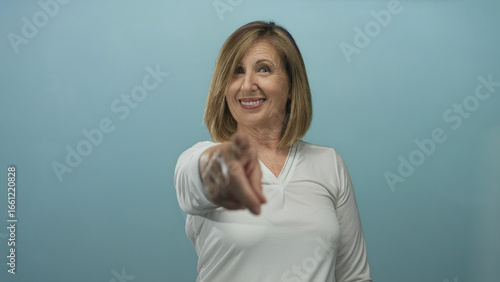 Middle aged woman smiling shapes heart gesture with fingers before light blue studio wall; affection connection warmth joy.