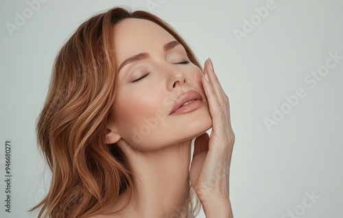 Middle aged woman with brown hair touching her face, eyes closed, smiling, shot on white background with copy space in light pink and beige tones, for advertising a cosmetic product