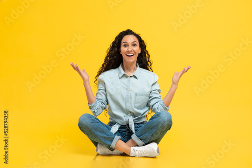 Middle Eastern Lady Smiling To Camera Sitting Over Yellow Background