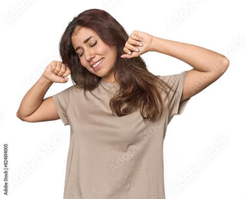 Middle Eastern woman in studio celebrating a special day, jumps and raise arms with energy.