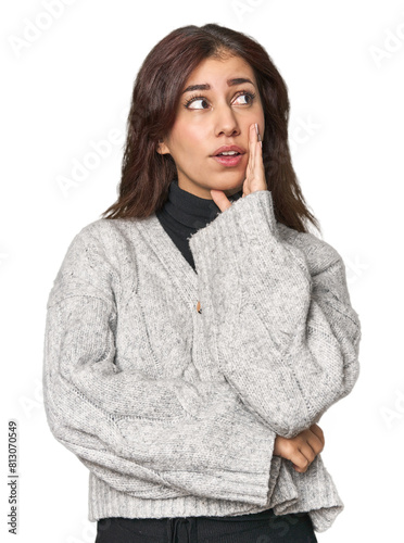 Middle Eastern woman in studio is saying a secret hot braking news and looking aside