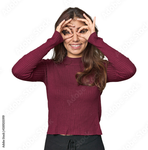 Middle Eastern woman in studio showing okay sign over eyes