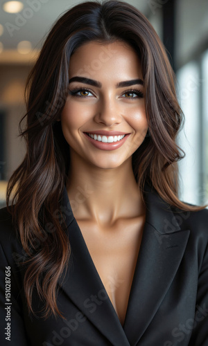 Middle Eastern woman with thick, wavy hair styled in a chic updo, exuding sophistication and leadership, with a bright smile