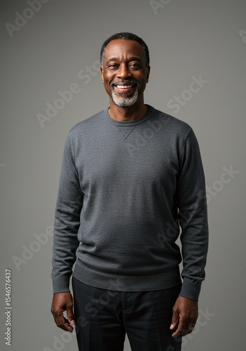Middle-aged African American man in sweater and slacks, standing gently with arms at sides in gray studio.