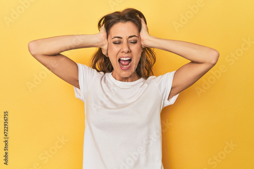 Middle-aged caucasian woman on yellow covering ears with hands trying not to hear too loud sound.