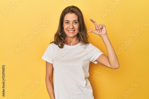 Middle-aged caucasian woman on yellow holding something little with forefingers, smiling and confident.