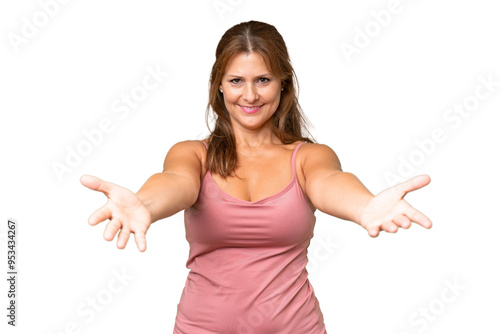 Middle-aged caucasian woman over isolated background presenting and inviting to come with hand