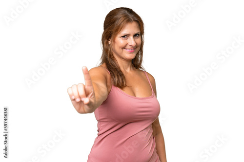 Middle-aged caucasian woman over isolated background showing and lifting a finger