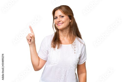 Middle-aged caucasian woman over isolated background showing and lifting a finger in sign of the best