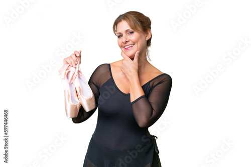 Middle-aged caucasian woman practicing ballet over isolated background happy and smiling
