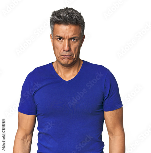 Middle-aged Latino man sad, serious face, feeling miserable and displeased.