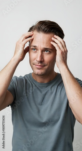 Middle-aged man showing visible signs of hair loss, touching his scalp with concern. Ideal for hair care, hair loss treatment, trichotherapy, and male wellness-related content.