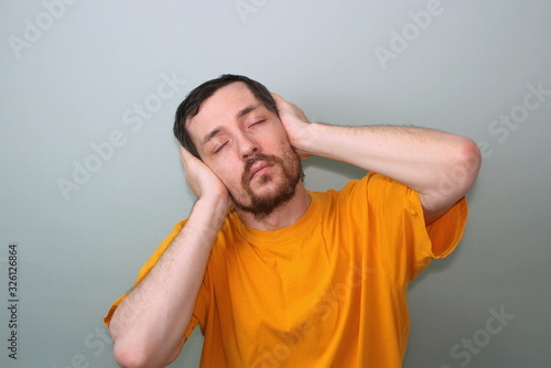 Middle-aged man with a mustache and a brunette beard in a yellow T-shirt on a gray background with closed eyes he covered his ears with the palms of his hands and bent as if he was listening to music
